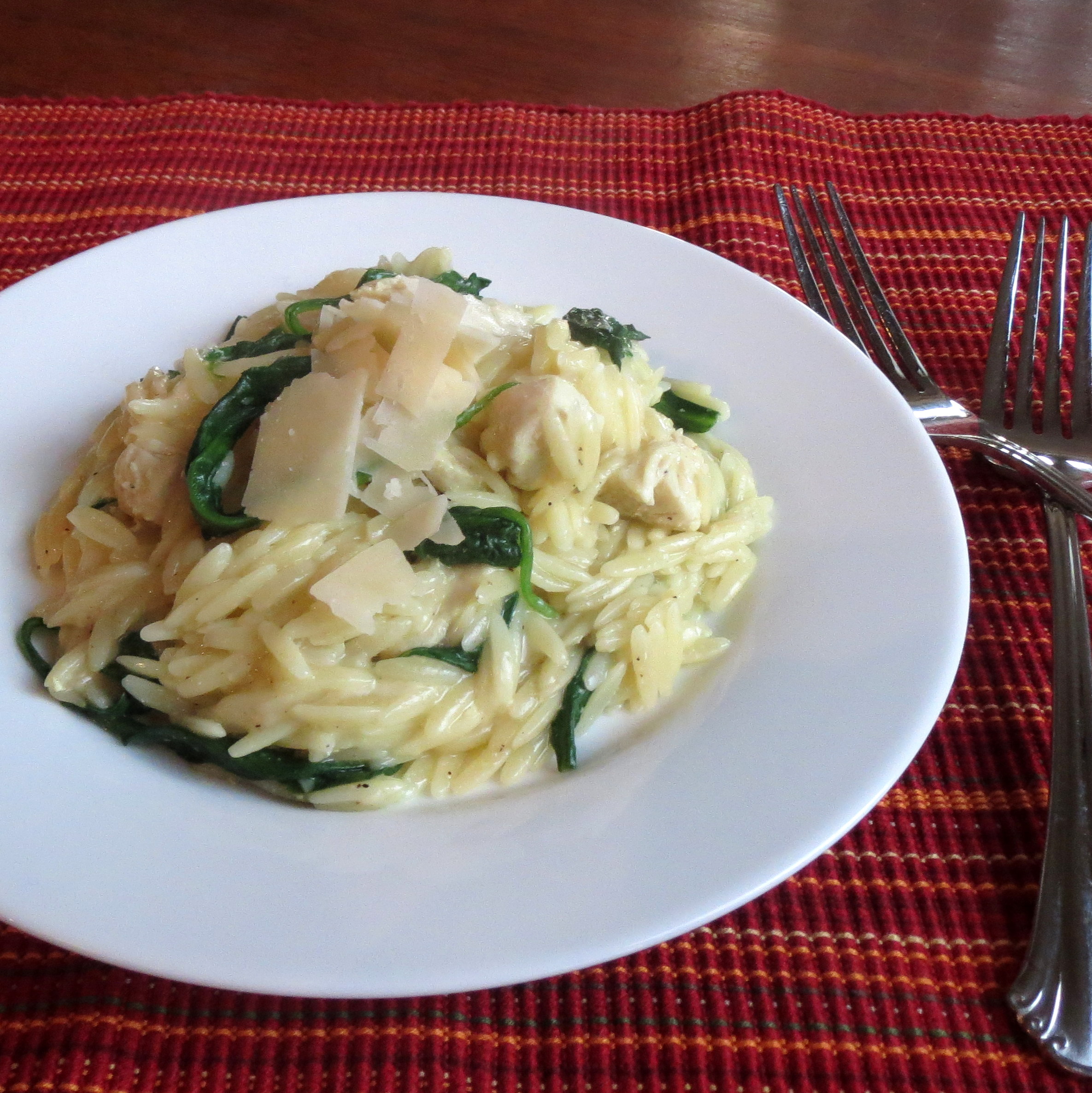 Garlic Chicken with Orzo Noodles I Rumbly in my TumblyFar and away, this is one of my very favorite weeknight dinners, because it is so quick and easy, and so delicious.  Oh, and when I make it, my kids eat spinach. 😉