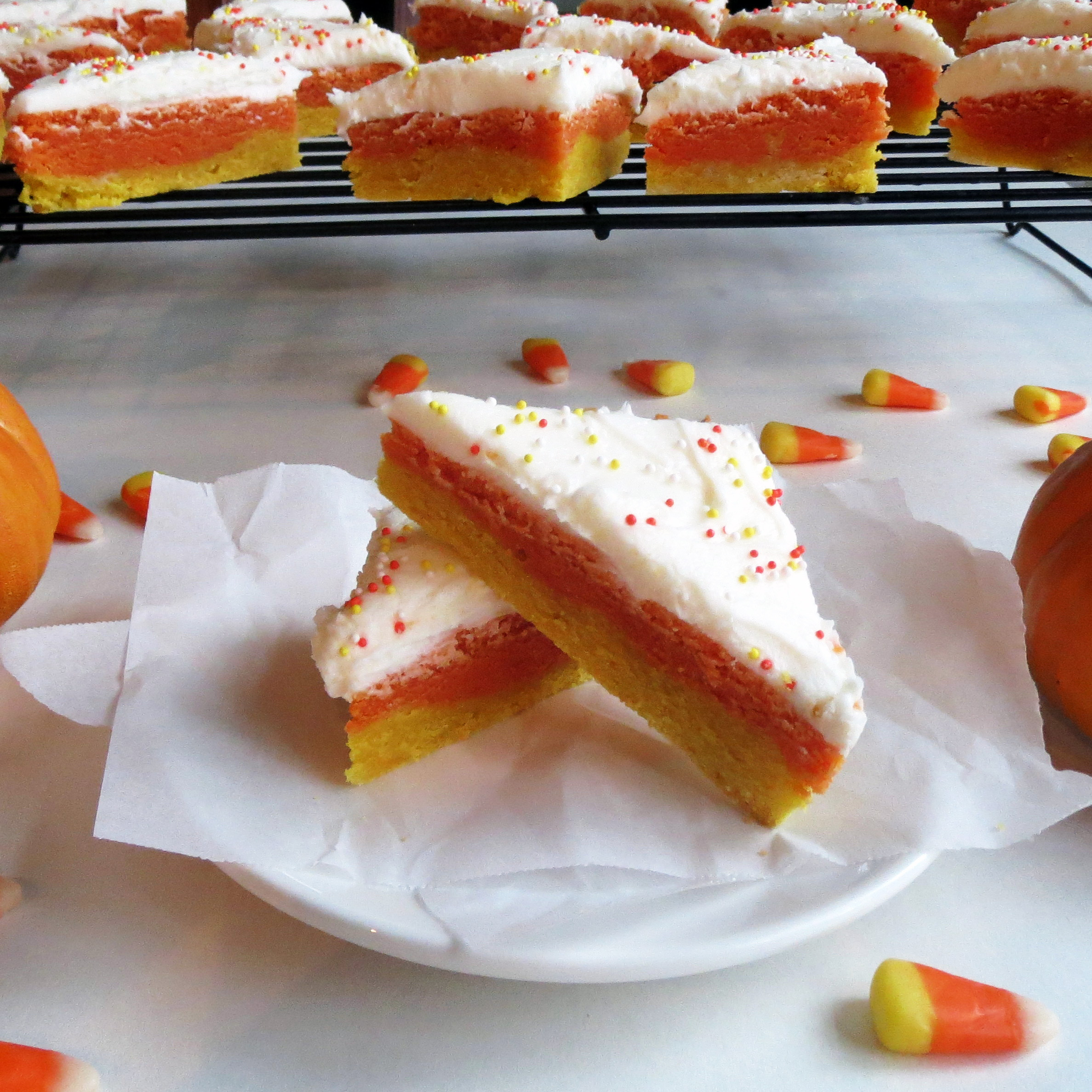 #7 Candy Corn Sugar Cookie Bars. A fun, festive, a different Halloween dessert. Tasty, too!