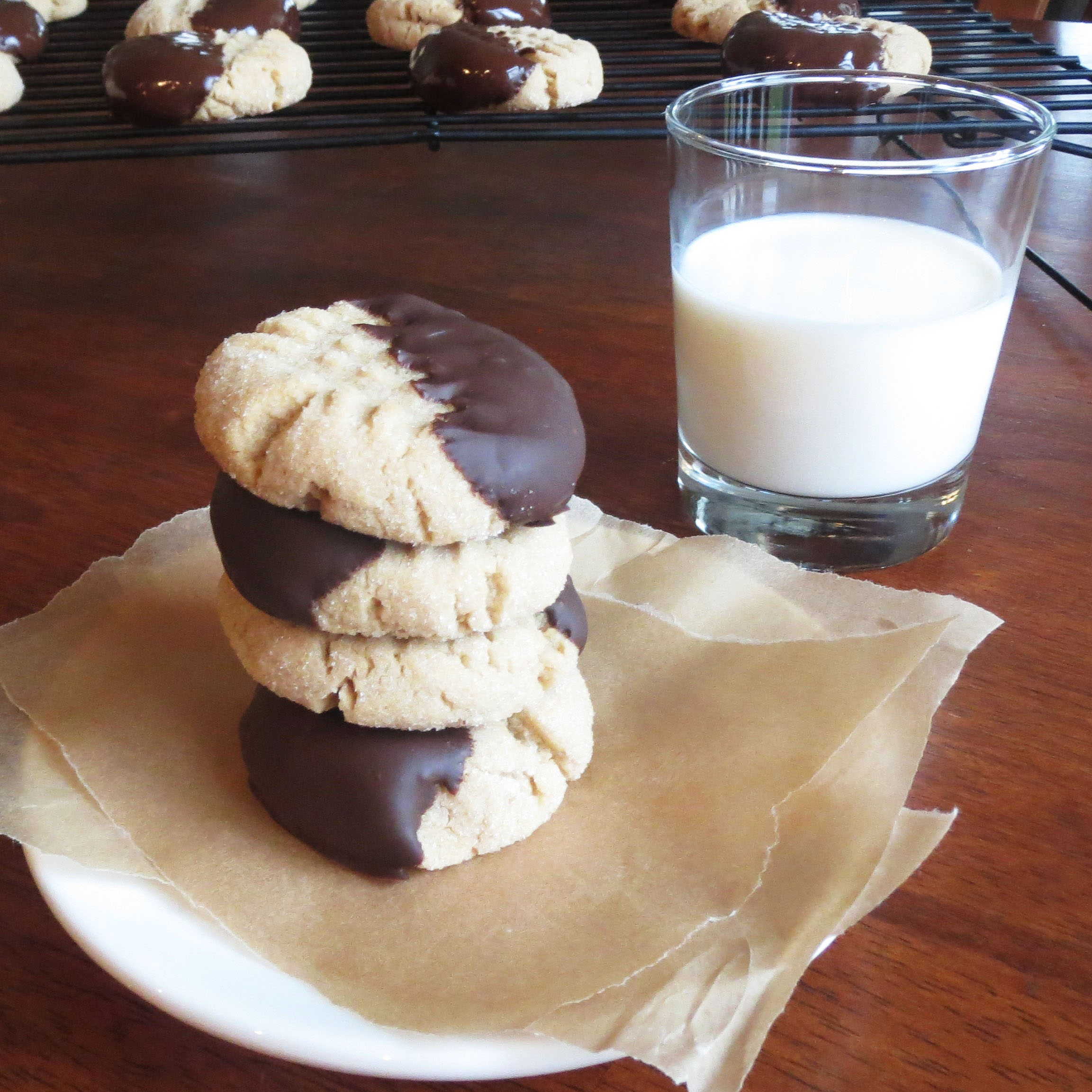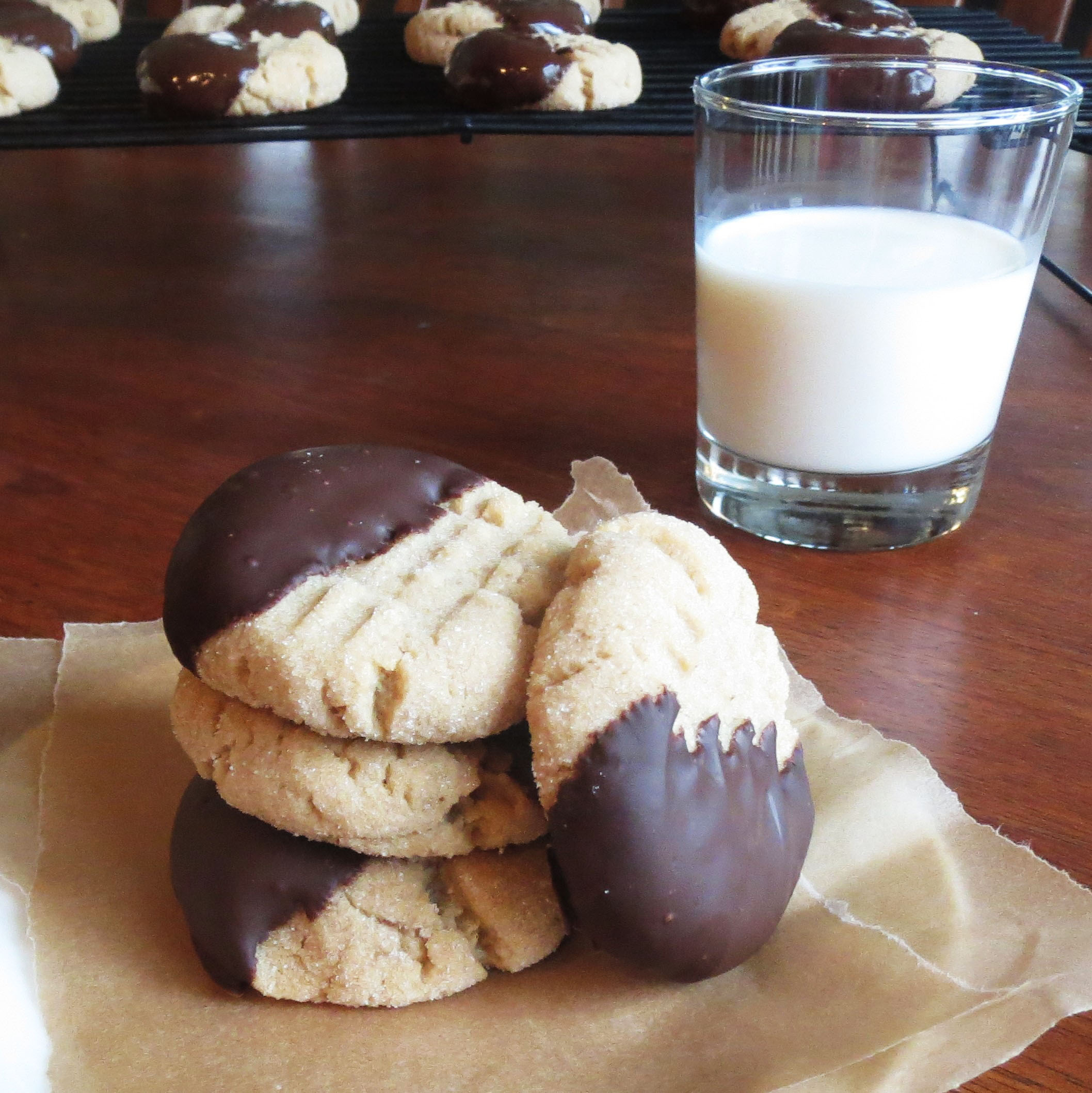 I got the idea for this cookie on Pinterest, and was immediately ashamed that I hadn’t thought of it myself. After all, I consider the combination of chocolate and peanut butter second only to cinnamon, and the idea to dip a peanut butter cookie into chocolate had never even occurred to me.