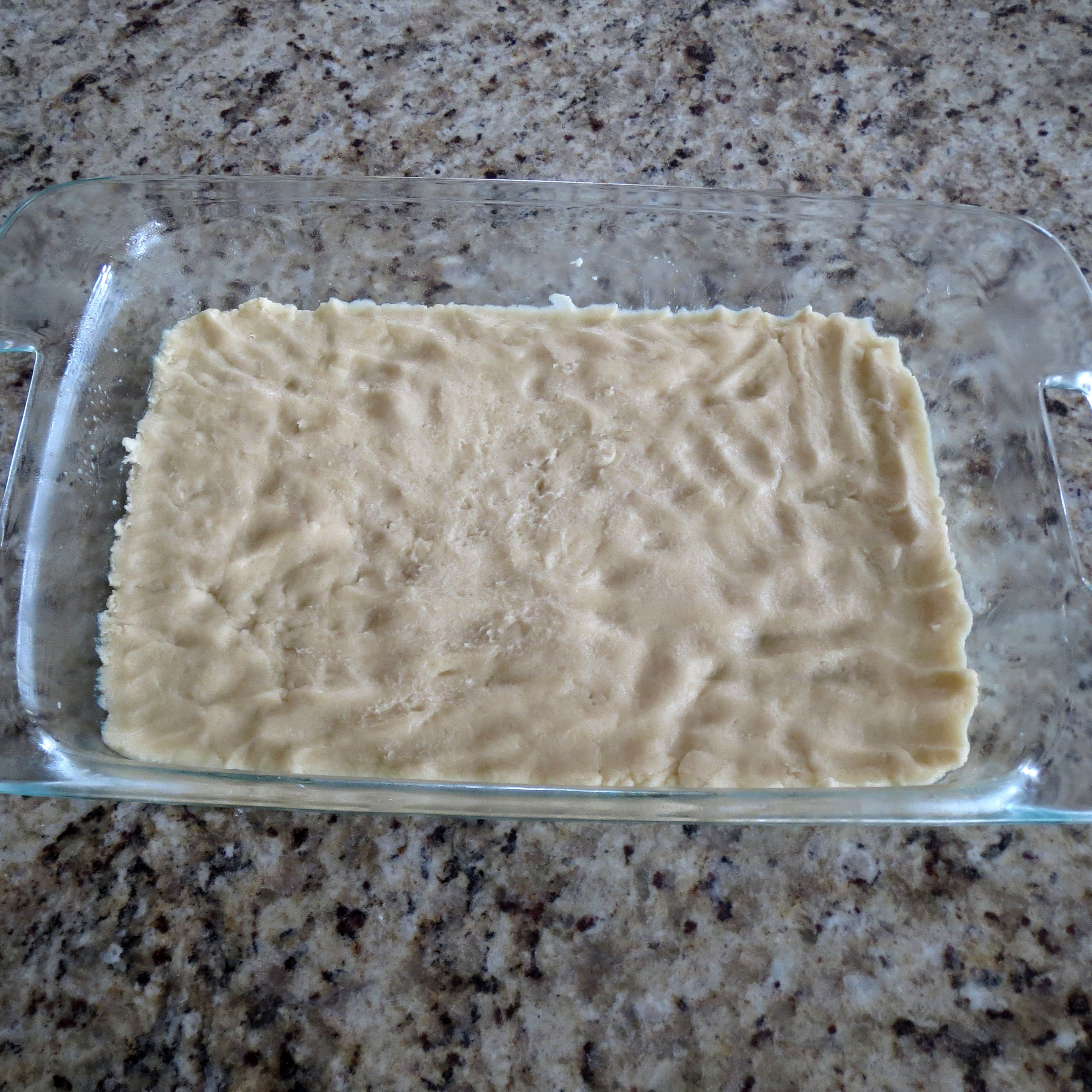 Gently pat 2/3 of the dough into the bottom of the baking dish. It will be thin. I find this works best if you use clean, wet hands.