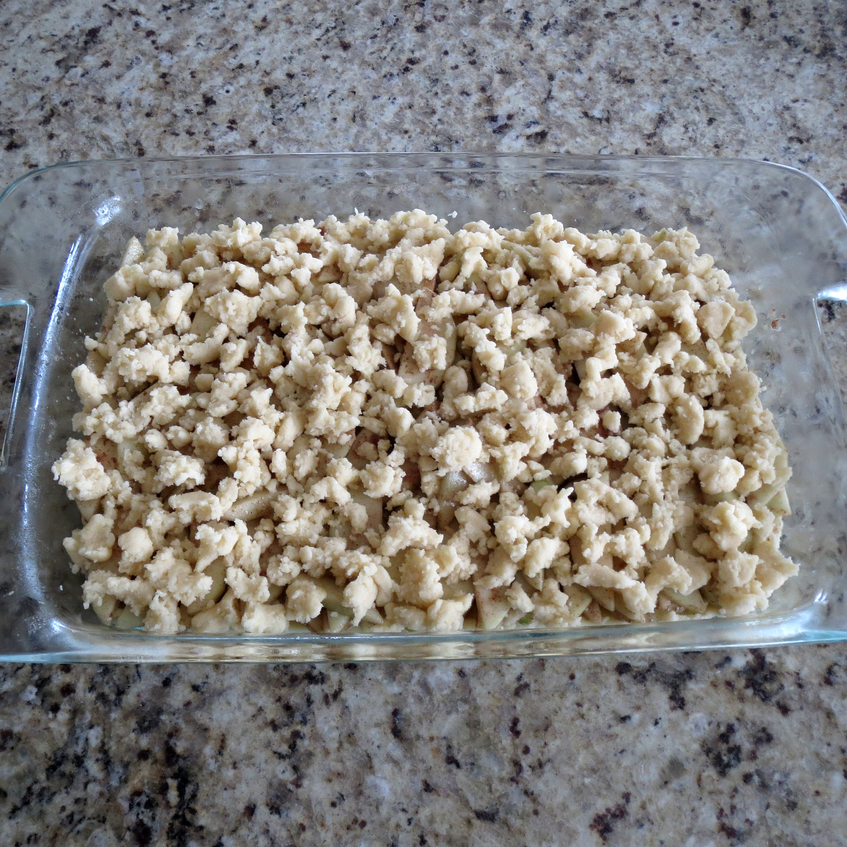Take the remaining 1/3 of the dough and break it apart into crumbles, spreading evenly over the top of the apple mixture. Be patient and do this neatly and evenly.