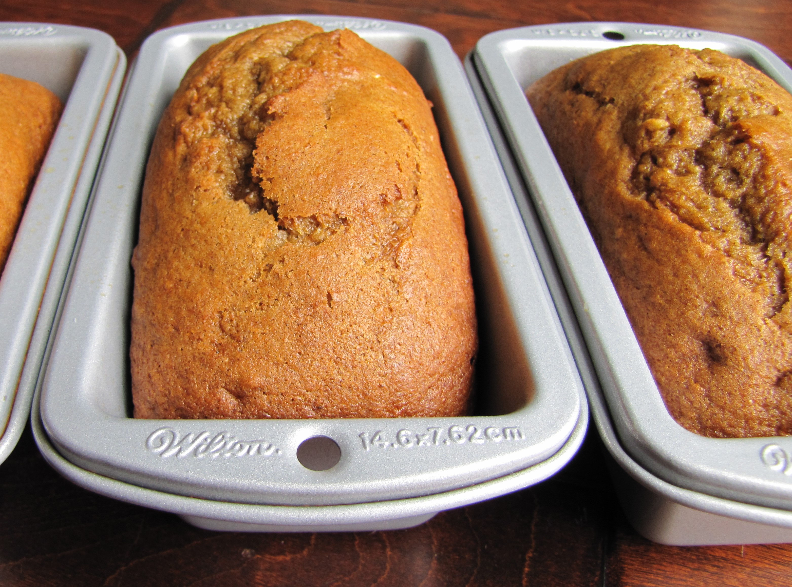 Pumpkin Banana Bread by Rumbly in my TumblyI am a big banana bread person.  I love it.  I don’t get depressed when I see the bananas I bought earlier in the week slowly browning and rotting away.  I get excited, because it means I’ll get to make some banana bread or banana muffins or something. I have a whole category on this blog devoted to bananas.
