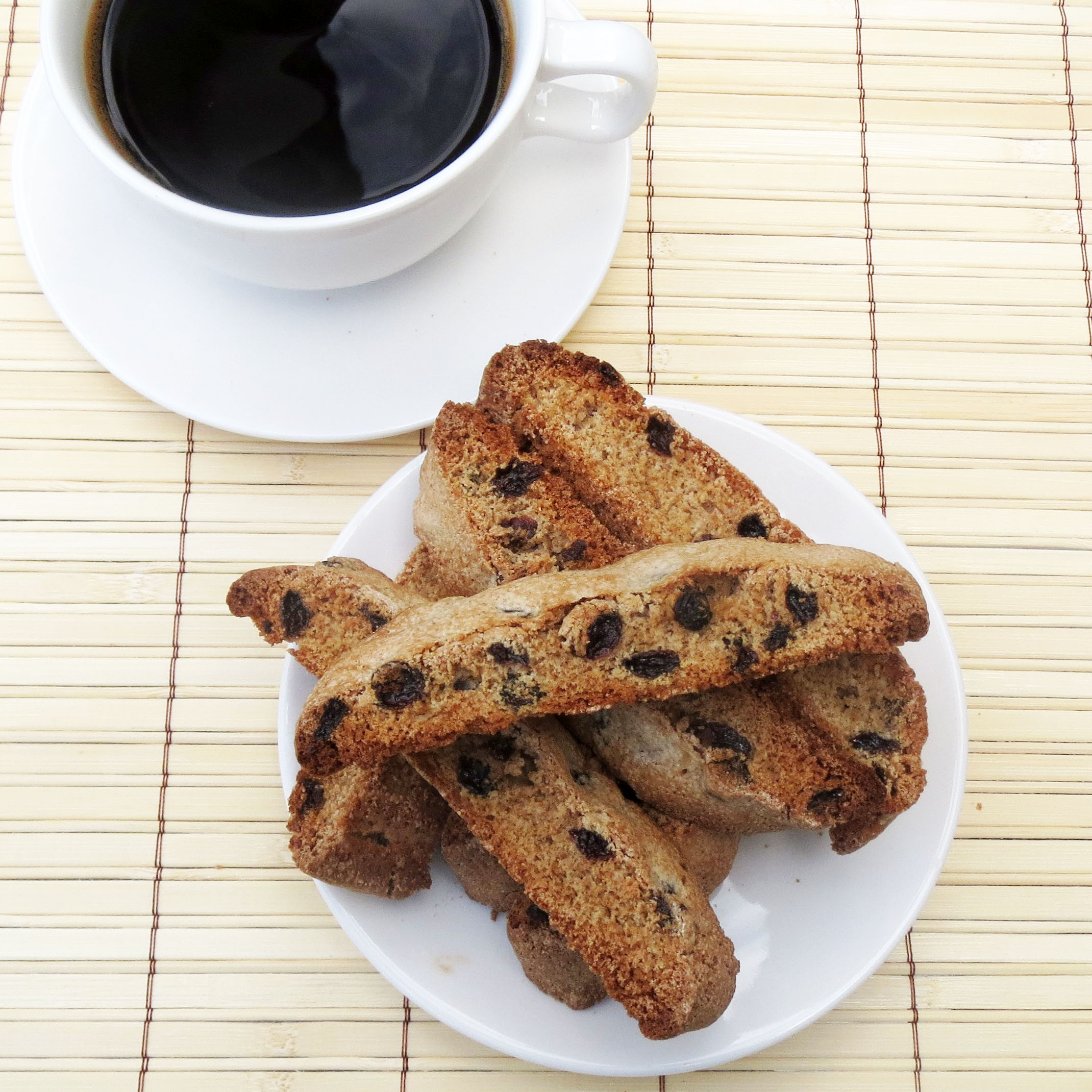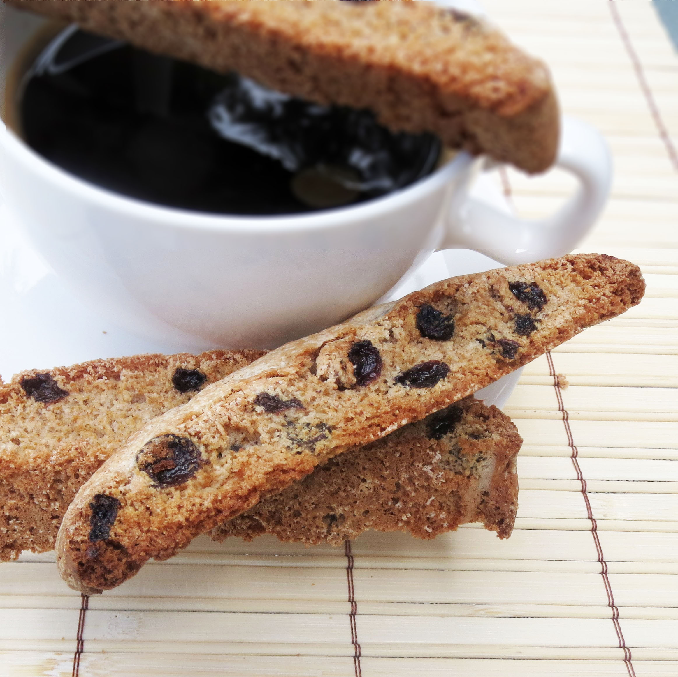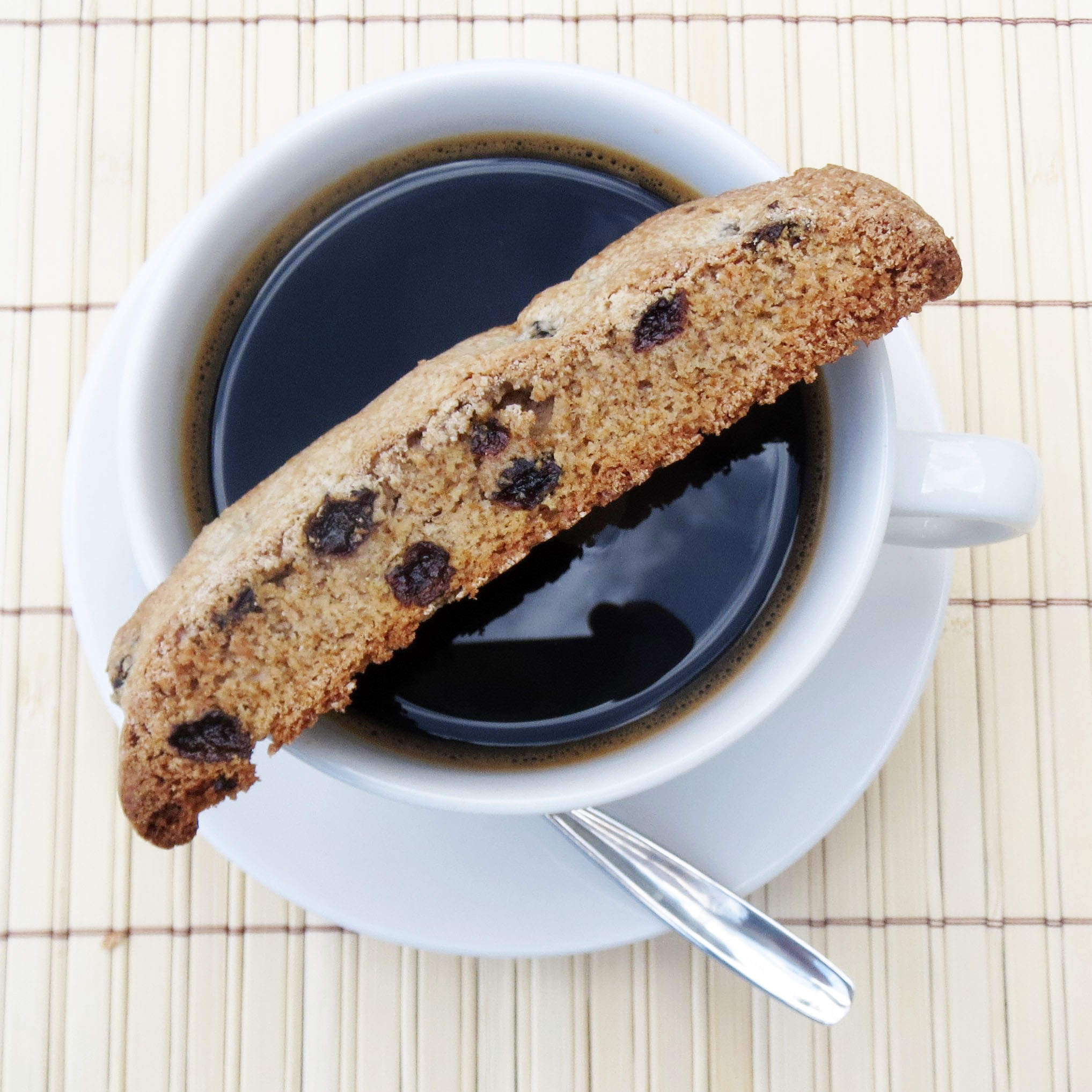 There are a few beautiful things about biscotti. First, the twice baked process makes them very dry and they store (in an airtight container) for a very long time. Another beautiful thing is that they have no butter/oil/fat in them, so you don’t feel so guilty eating them. And the most beautiful thing about biscotti is the way it tastes when you dunk it into a nice cup of coffee or tea.