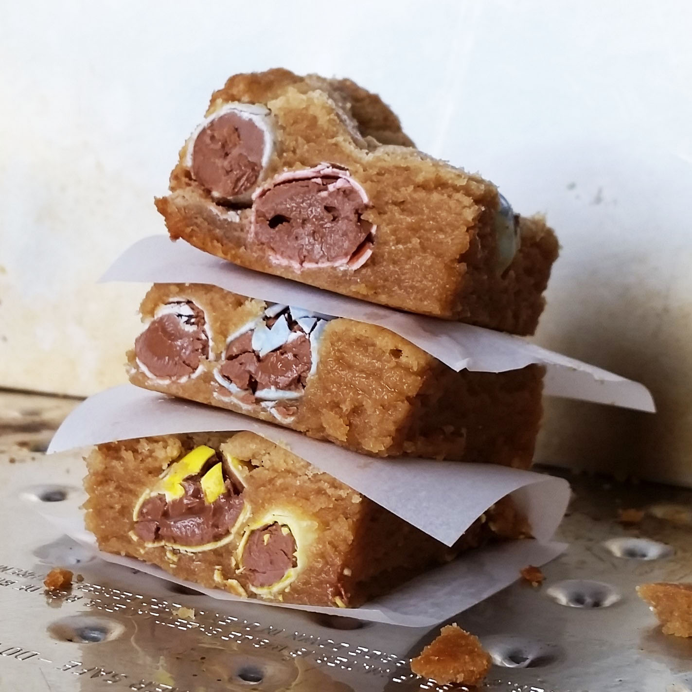 Add the flour, baking powder, and salt, and mix until just combined. Mix in the chocolate eggs by hand, reserving about 1/4 of them to place on the top.