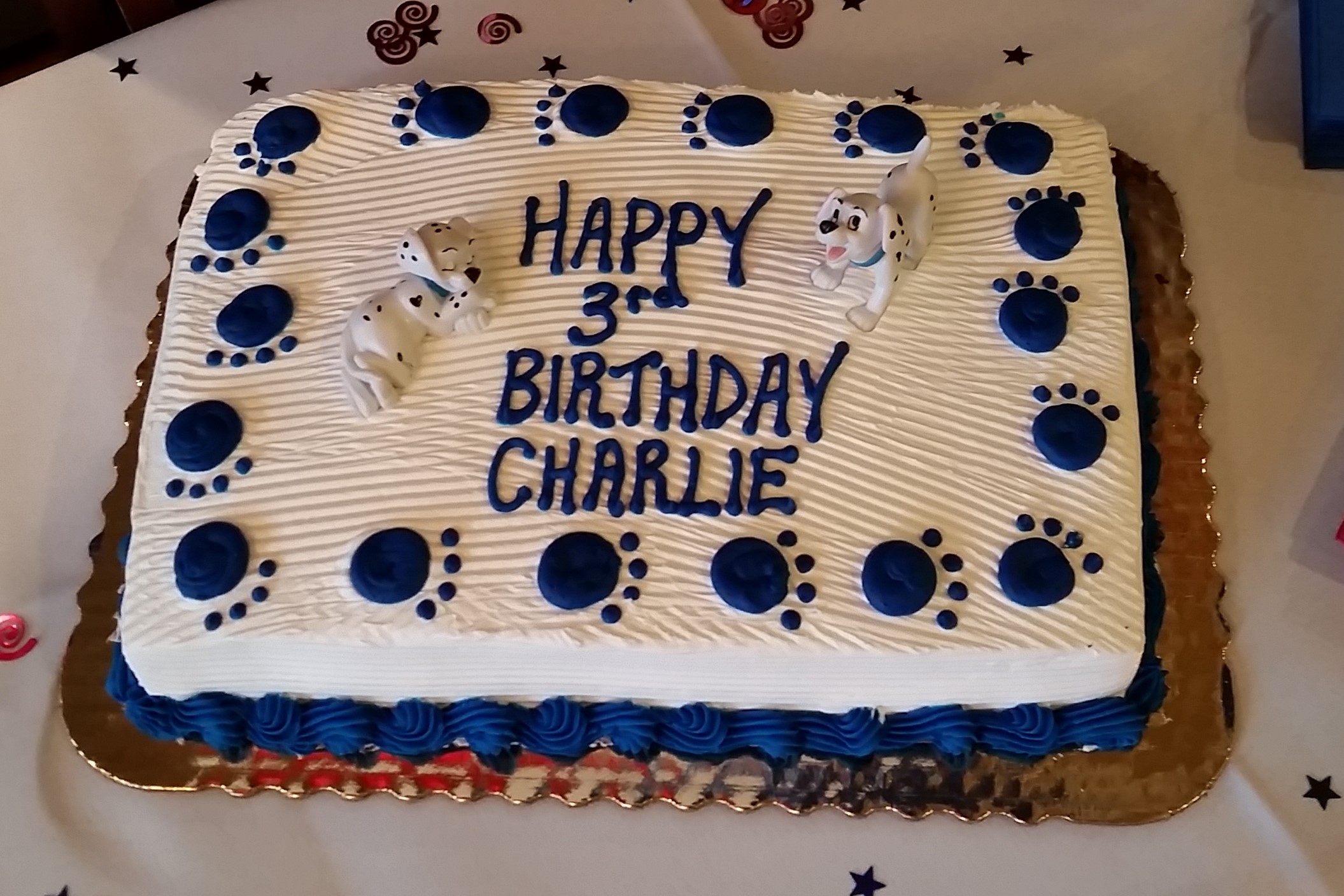 I ordered their cakes from a bakery. (I just don’t have the patience for cake decorating- I only make non-decorated cakes) I just asked them to do colored paw prints around the edges, and then I placed a couple of 101 Dalmatians figurines from the Disney Store on each one.