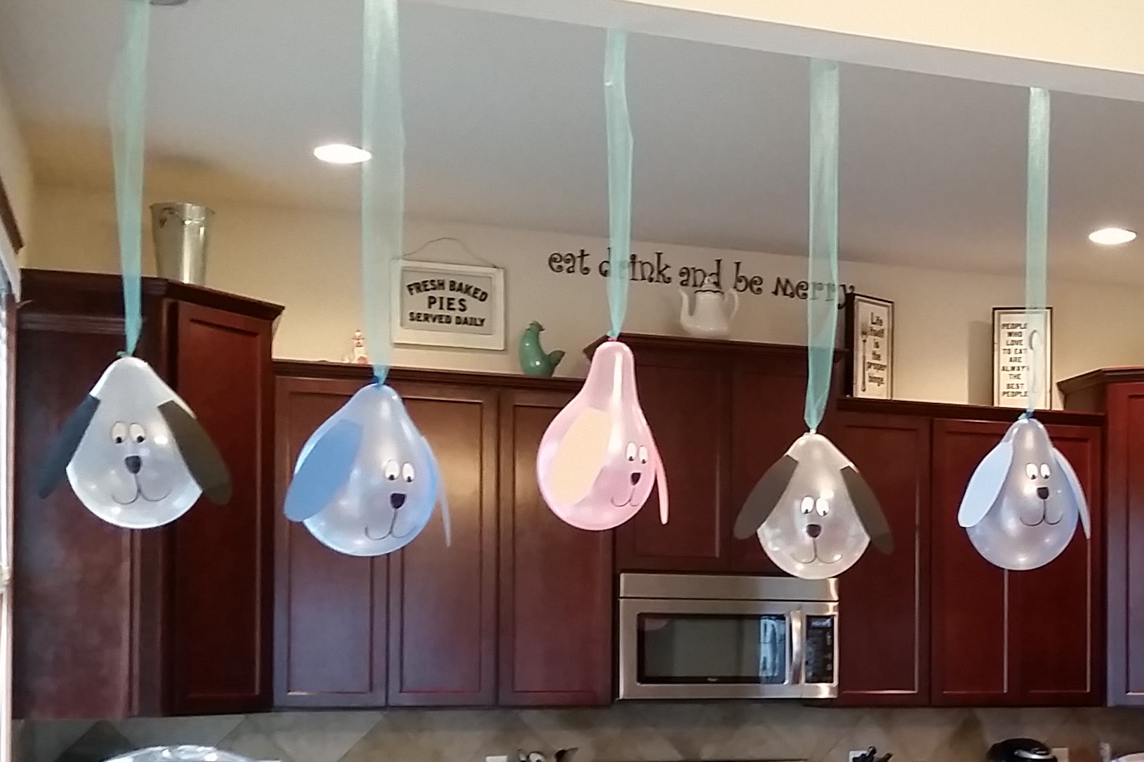 Puppy Balloons! – For these, I just drew some eyeballs on white paper with a black sharpie, cut ears out of construction paper as well, blew up balloons, and drew faces on with a sharpie. So easy! Then I hung them upside down from the ceiling. I found the super cute paw print balloons at my local Party Store. They also carry them at Hobby Lobby.