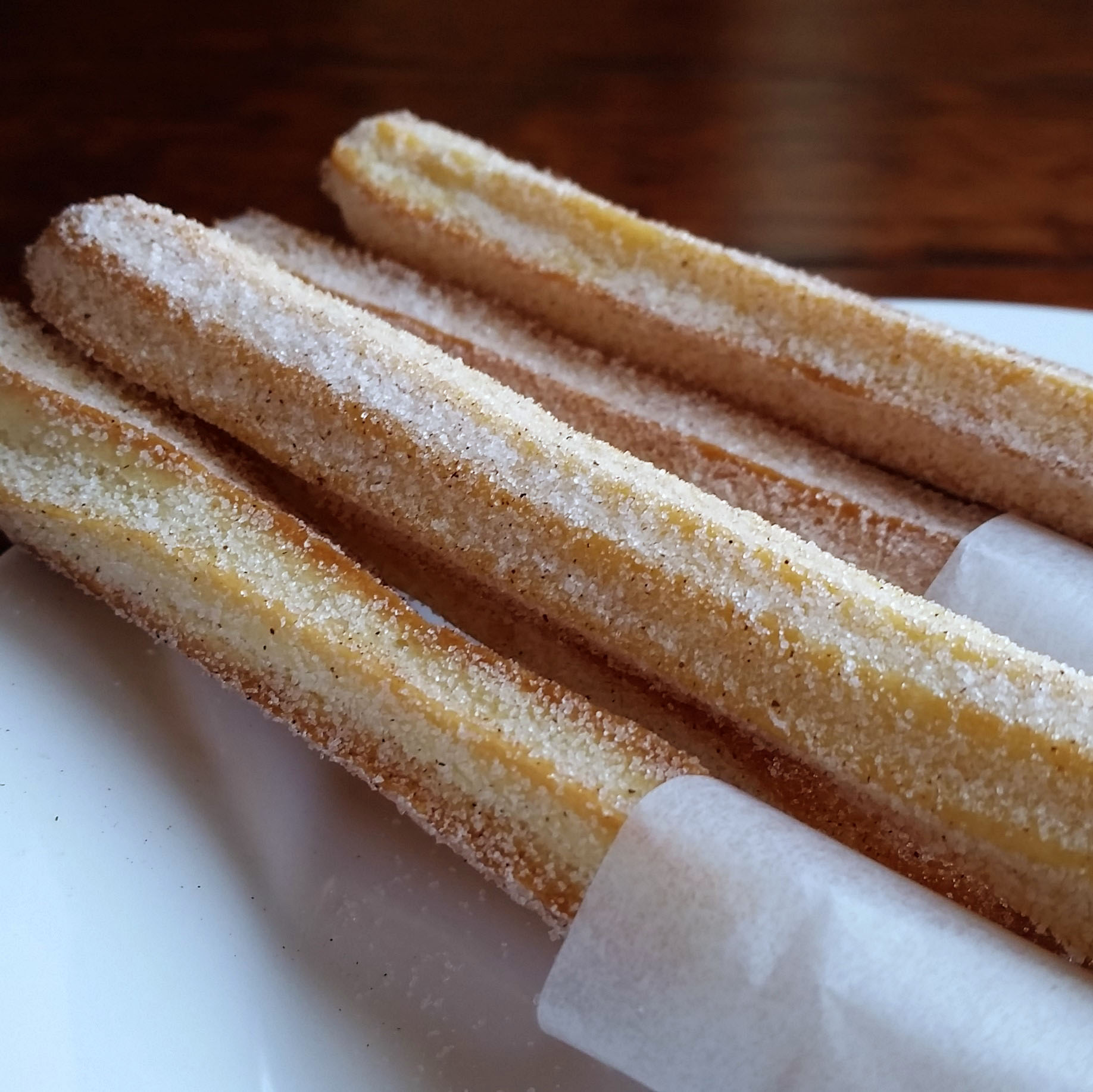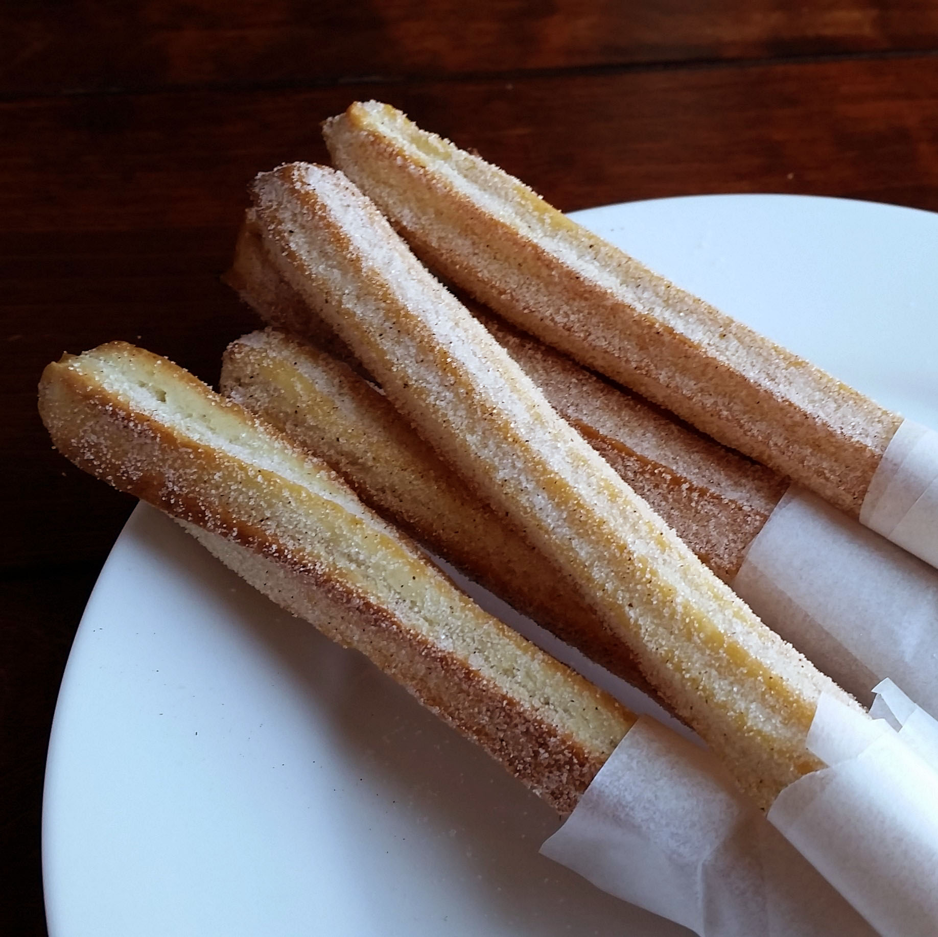 5. Bake for 10-12 minutes or until slightly puffed. Turn oven to broiler setting and watch carefully as churros toast and turn deep golden brown. Remove from oven and let cool slightly. Transfer to a wire cooling rack. If you’re baking the churros one pan at a time, be sure to return the oven setting to 425 degrees F before putting in the next pan.