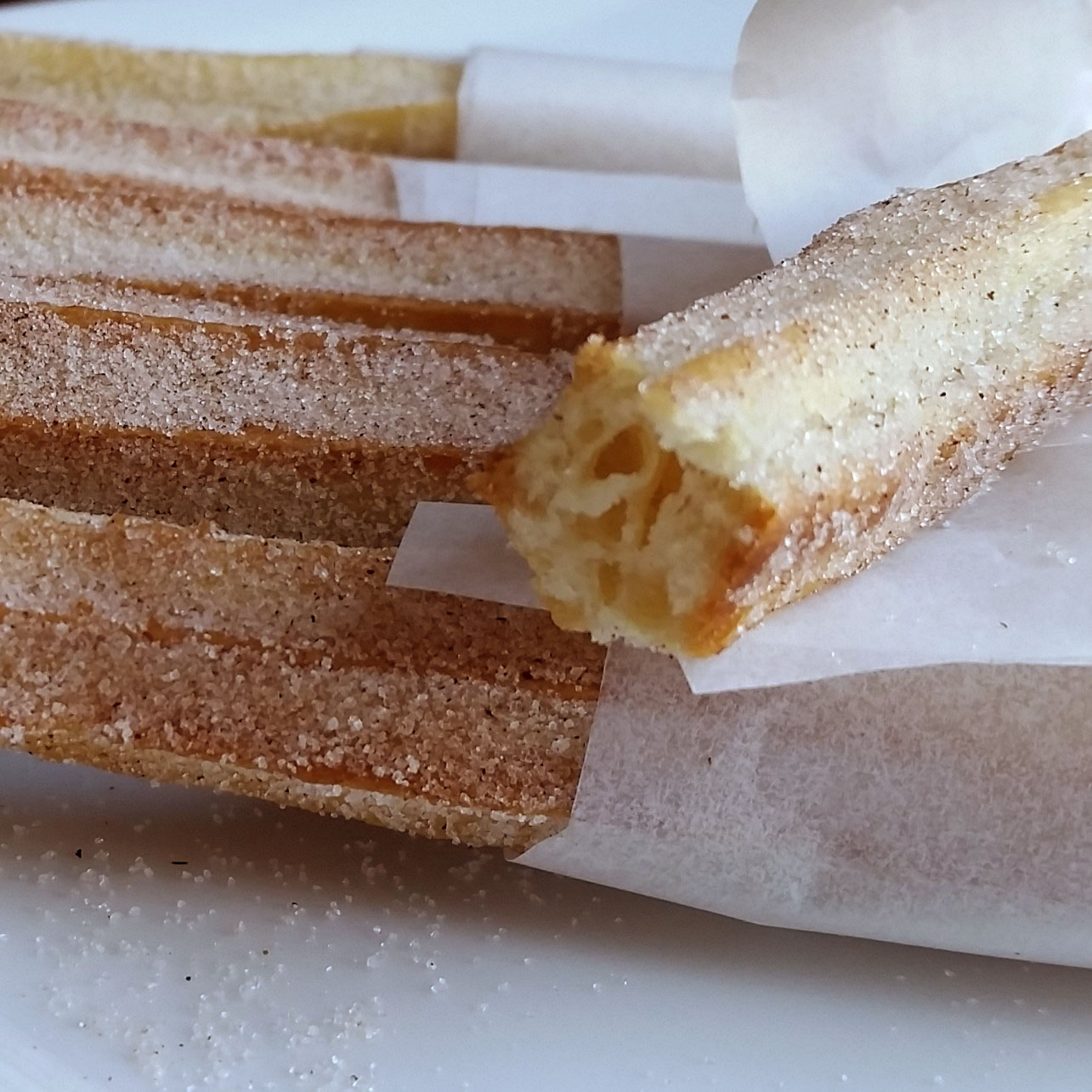 6. Combine sugar and cinnamon and pour onto a long dish (Image 2). Roll churros in mixture. Serve.