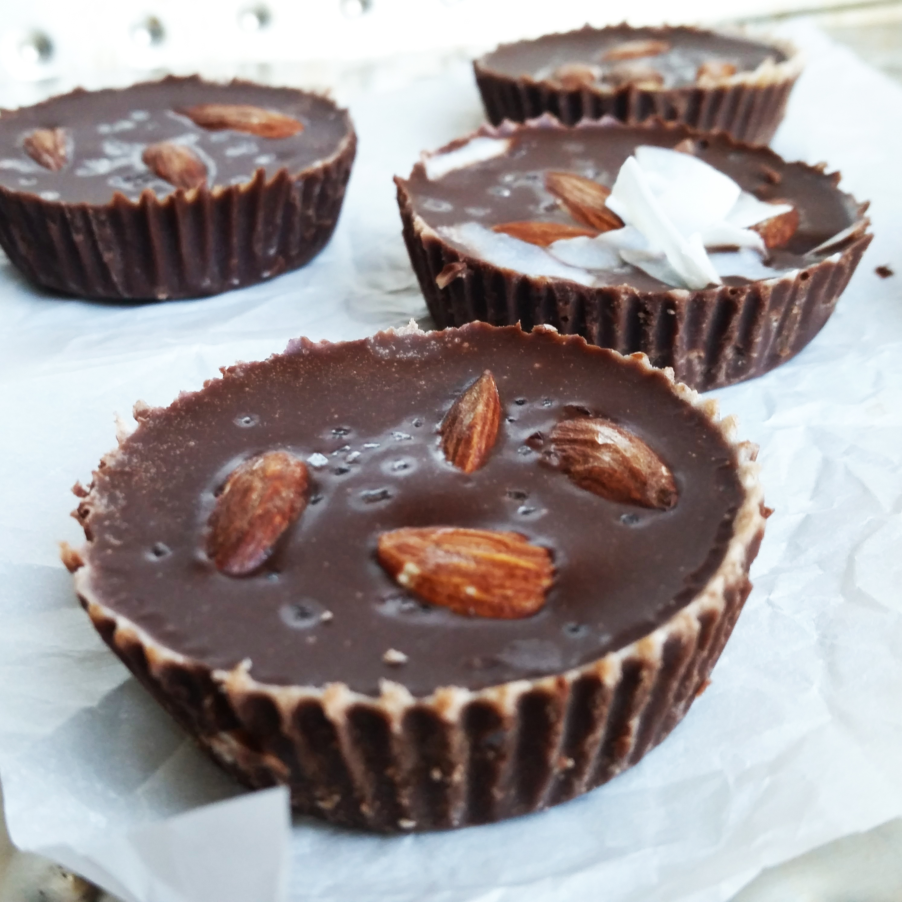 Spoon evenly into 12 prepared muffin tins.  Top with whatever you like (my favorite combo is salted almonds, coconut flakes, and coarse sea salt.)  Refrigerate for at least 30 minutes and serve.  Store in an airtight container in the refrigerator.