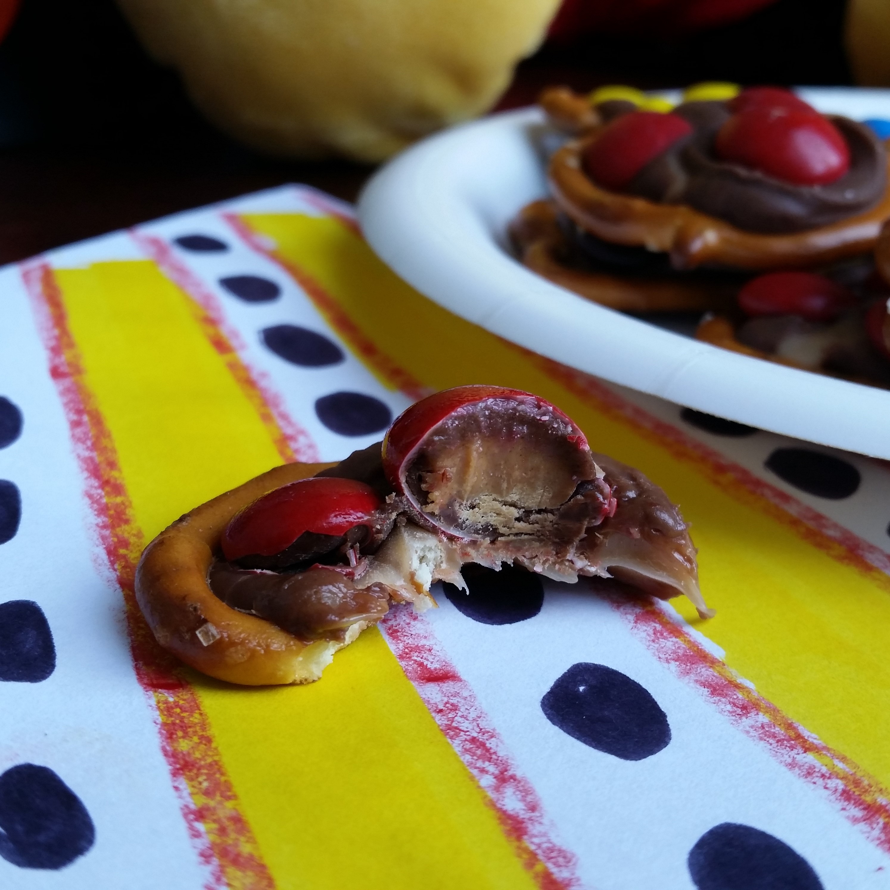 Place the Rolo covered pretzels in the oven for about 2 minutes. Watch them REALLY carefully. You don’t want them melted, just softened. When they are soft, pull them out of the oven, and press the M&Ms into the chocolate gently, into Mickey shapes.