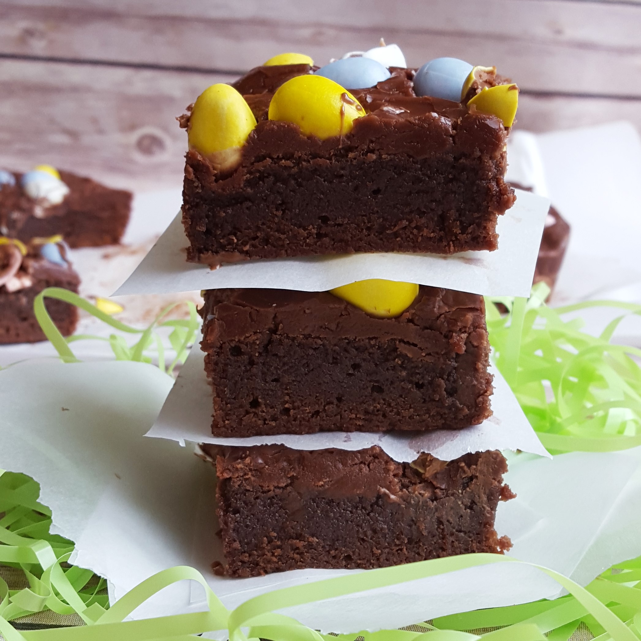 Last year, I made peanut butter egg blondies with these beauties. This year, I go full on chocolate overload and I made brownies. Moist, fudgy, amazing brownies with an excessive amount of eggs and butter to begin with, that I then topped with thick chocolate ganache and then pressed these delicious, creamy eggs into it while the ganache was still warm so they would get all melty.