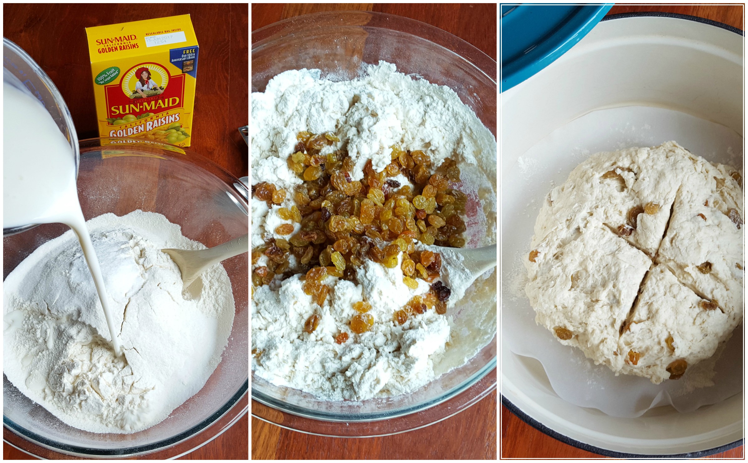 Mix together your flour, baking soda, sugar, and salt. Slowly pour in the buttermilk and mix until just incorporated. Add the raisins and turn the dough onto a lightly floured surface. Knead just once or twice until it is shaped into a nice, round loaf and place in prepared pan. Use a knife to make an X across the top.