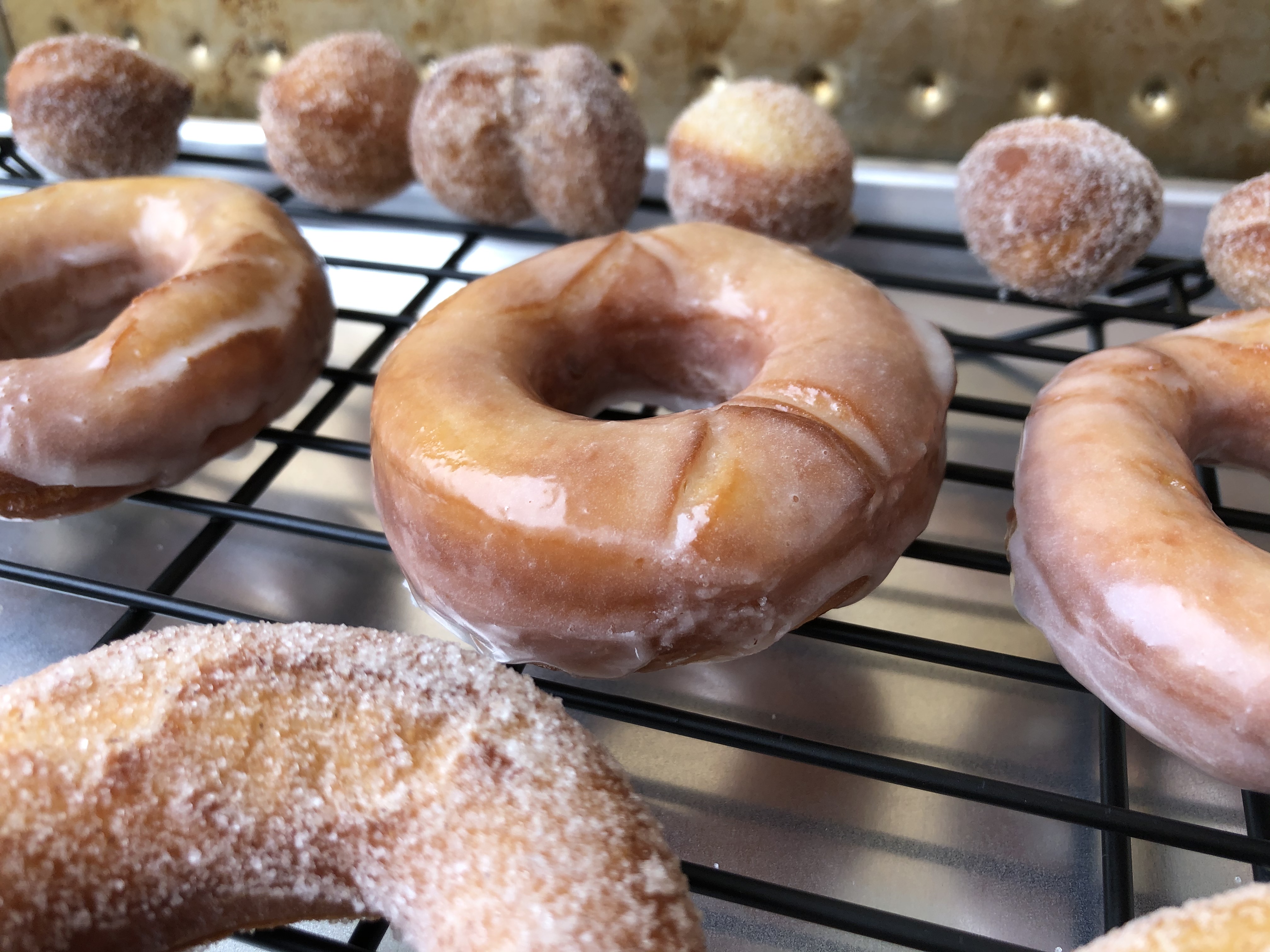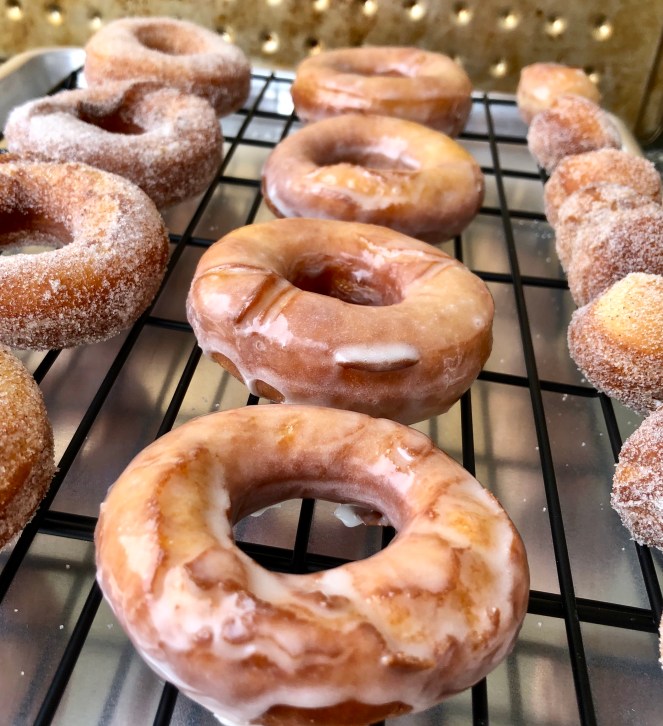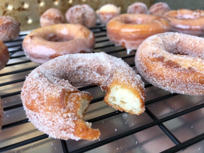 97% of the time is in the rising of the dough, which takes about an hour and a half. Other than that, you just mix a few things together, cut them out, and boom– donuts.