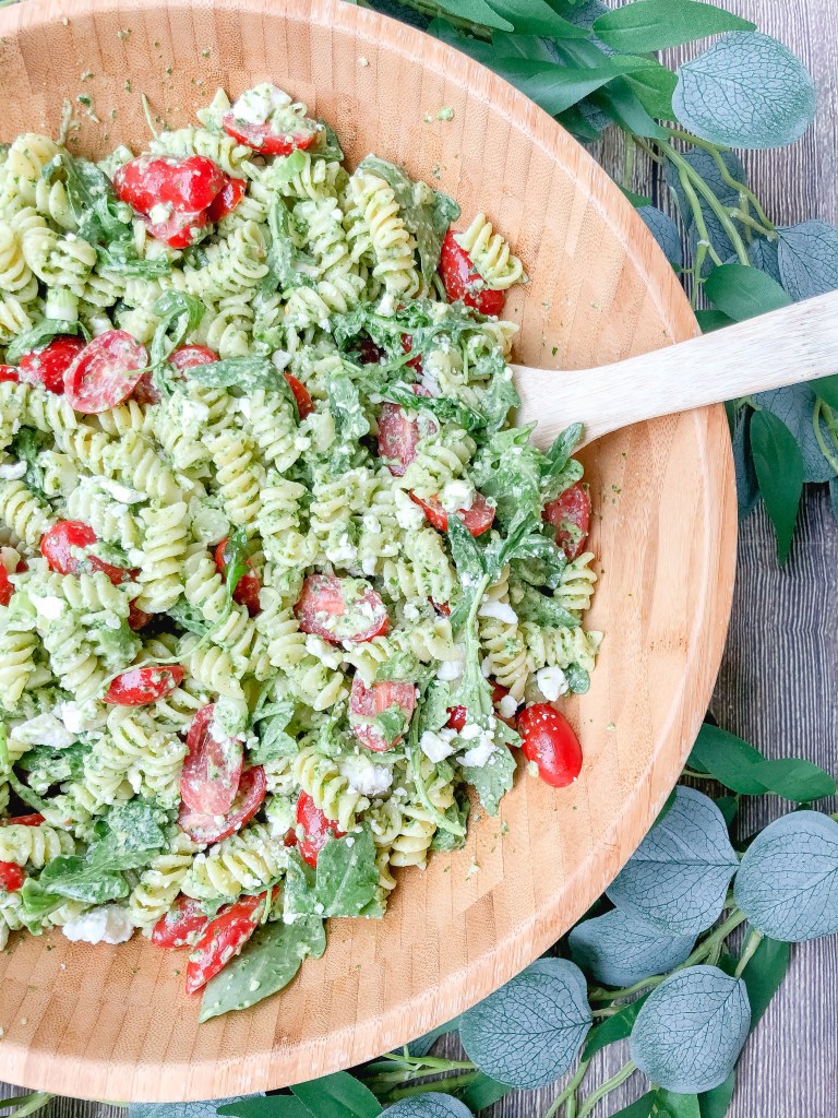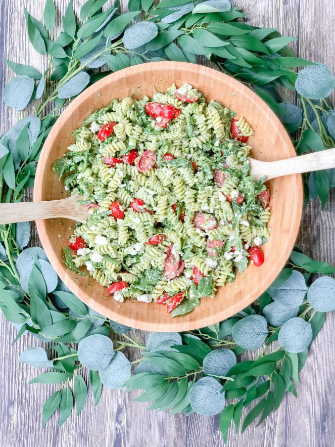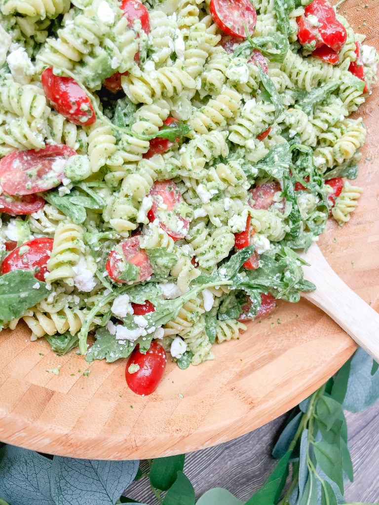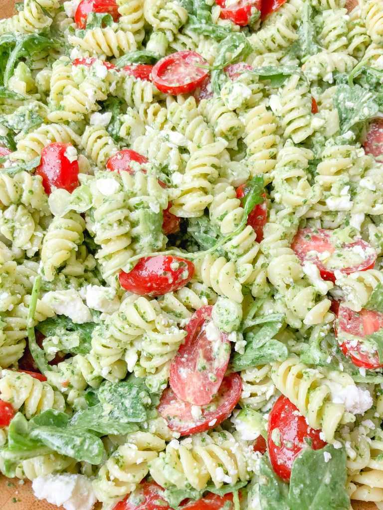 I love pesto and I love arugula, and I saw some ideas for pesto pasta salads and combined like 3 recipes to come up with this one. It is SO good. Creamy pesto, a touch of garlic, arugula, cherry tomatoes, green onions, and feta.