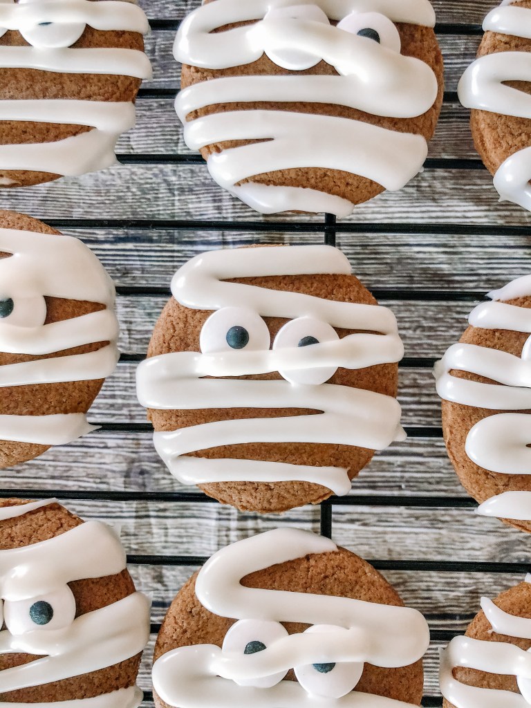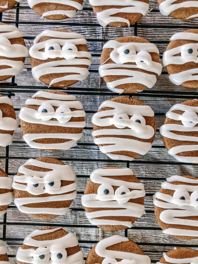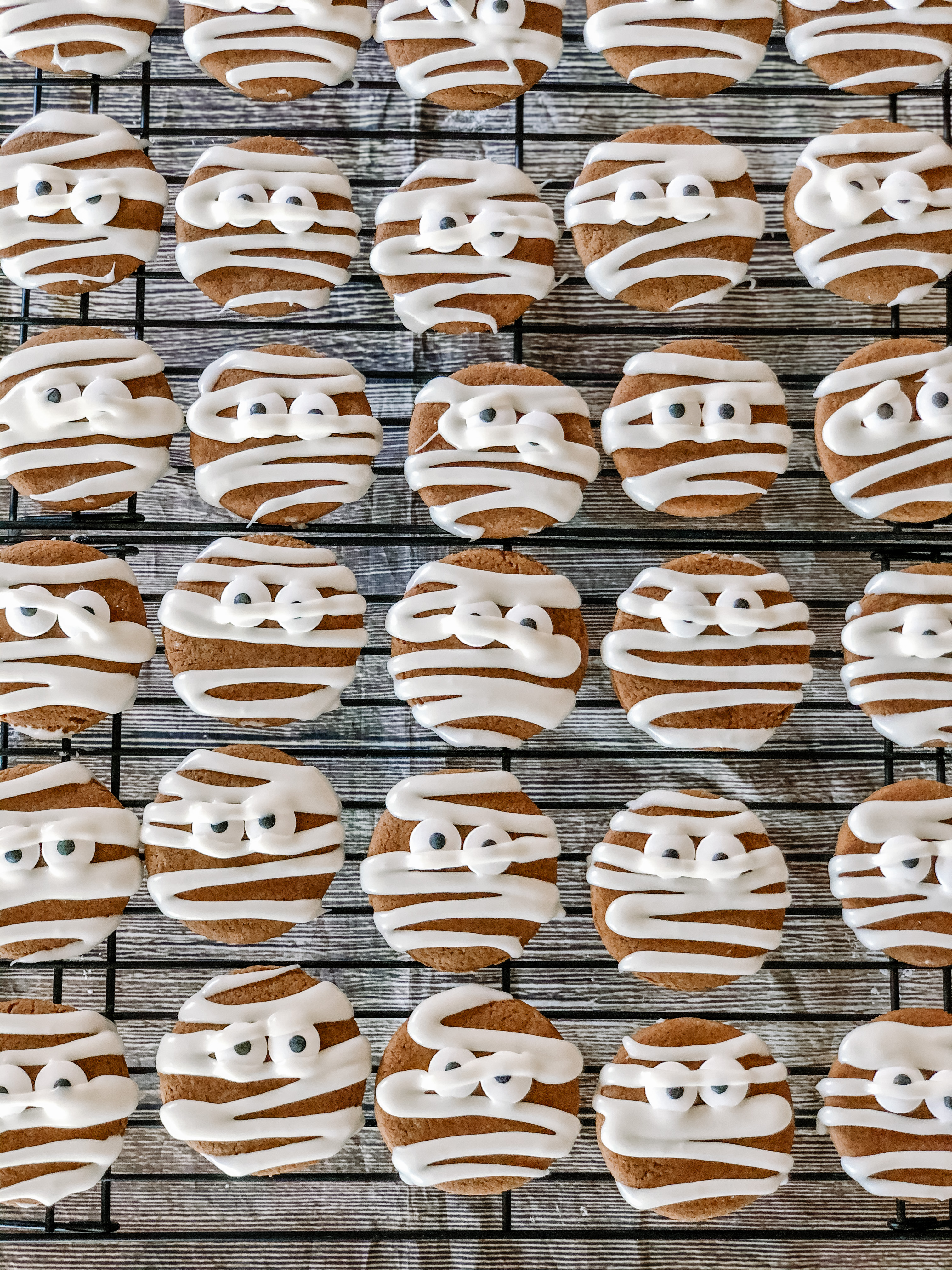 Add powdered sugar, corn syrup and vanilla to the bowl of an electric stand mixer. Fit mixer with paddle attachment, add in 4 Tbsp water and the vanilla them mix on low speed until combined. Add more water to thin as needed and increase speed and whip mixture until it is glossy and thickens up. Tint with food coloring if desired. Transfer to piping bags fitted with tiny round tips. Place two eyes on each cookie and swipe icing back and forth over each one in a mummy shape.